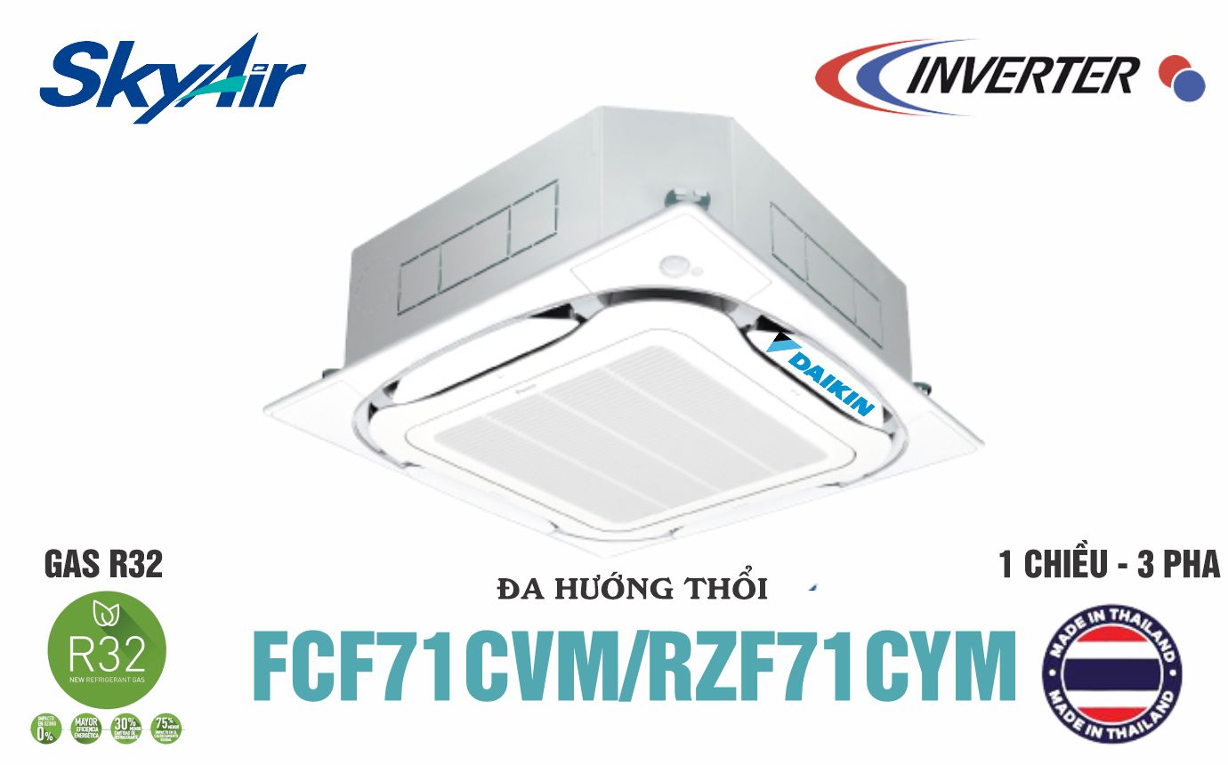 - Máy điều hòa âm trần Daikin FCF71CVM/RZF71CYM 1 chiều, 3 pha, công suất 24000BTU (2.5HP) công nghệ inverter tiết kiệm điện, sử dụng gas R32 hiệu suất làm lạnh cao, thân thiện với môi trường được sản xuất nhập khẩu chính hãng Thái Lan.