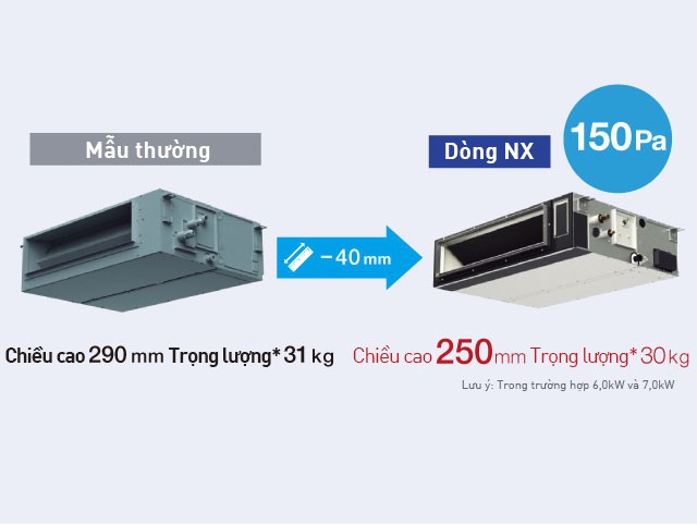 Khả năng lắp đặt theo chiều dọc: Dòng NX âm trần nối ống gió mới có thể được lắp đặt không chỉ theo chiều ngang mà còn theo chiều dọc mà không cần sửa chữa. Thiết kế khay nước ngưng đột phá giúp cho việc lắp đặt trở nên linh hoạt dẫn đầu thị trường.