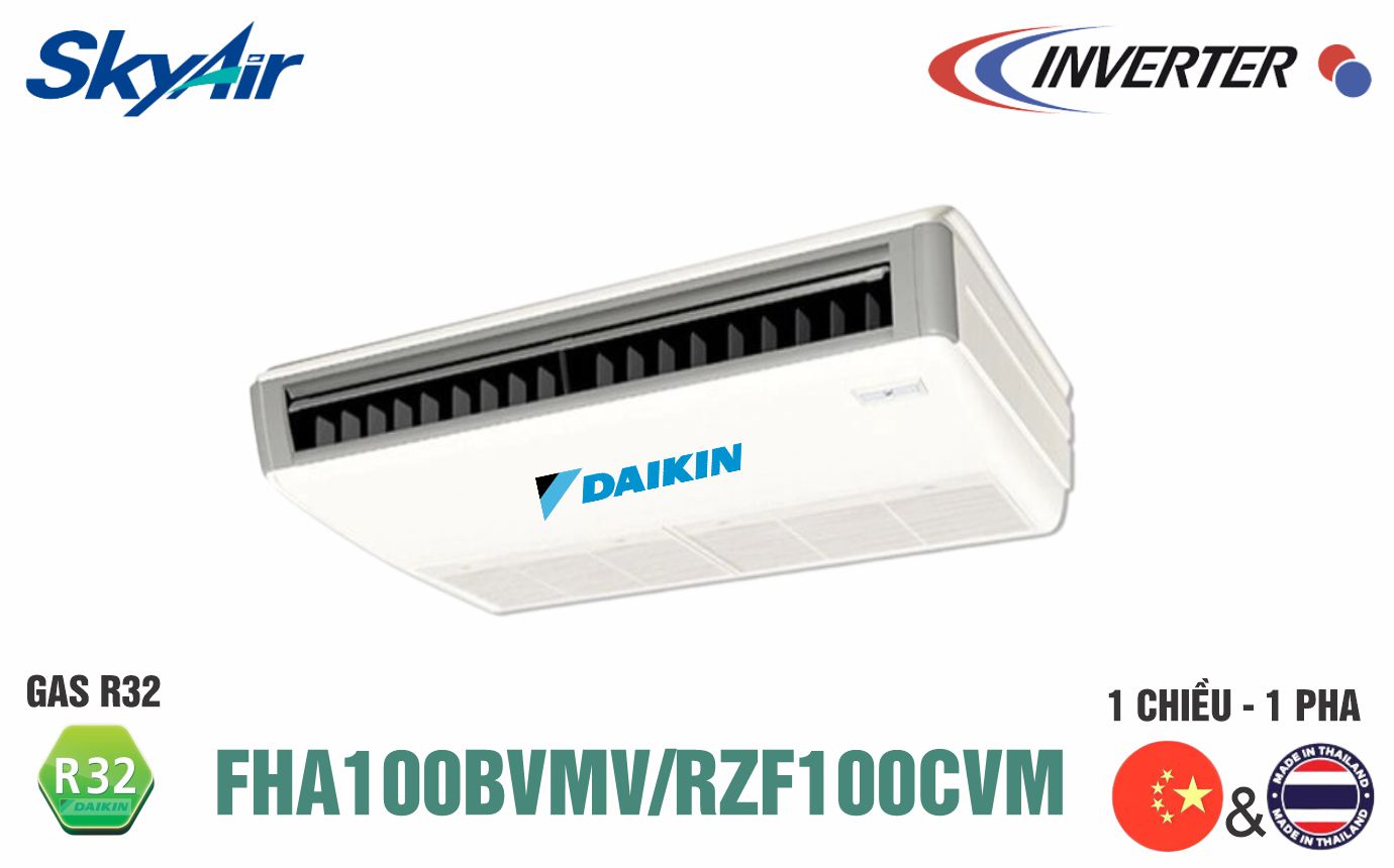 - Điều hòa áp trần 1 chiều 34.100BTU (FHA100BVMV/RZF100CVM) điều khiển không dây (BRC7M56) thuộc dòng điều hòa thương mại được sản xuất tại Thái Lan trên dây chuyền hiện đại tiến tiến của Nhật Bản.