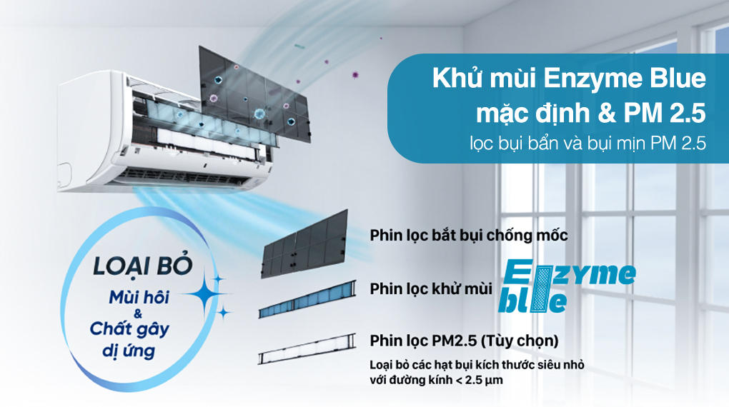 Lưu ý: Phin Lọc Enzyme Blue là mặc định có trên máy lạnh, phin lọc PM 2.5 không đi kèm với sản phẩm, khách hàng có nhu cầu có thể liên hệ hãng để được hỗ trợ