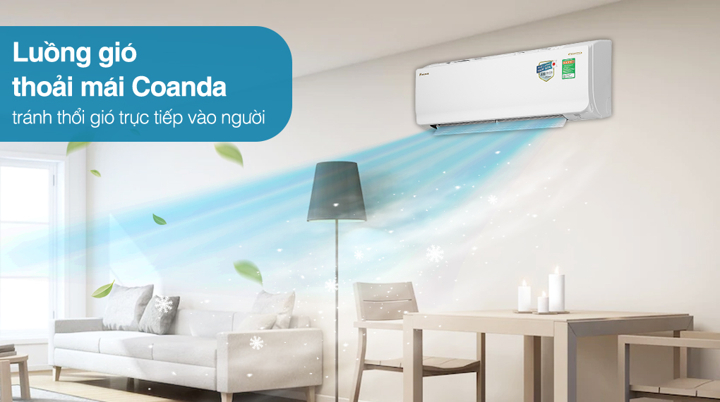Với thiết kế Coanda ở chiếc máy lạnh Daikin giúp mang đến cảm giác dễ chịu nhờ khả năng tăng tuần hoàn gió, việc thổi gió lên trần nhà giúp tránh thổi gió trực tiếp vào người gây cảm giác lạnh buốt.
