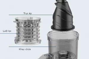 Cối ép/lưới lọc và bình tiếp liệu được thiết kế tích hợp thông minh. Lưới lọc được làm bằng inox 304 không gỉ với nhựa ABS cao cấp, không chứa chất độc hại, chịu va đập mạnh, khả năng chịu nhiệt cao và không bị ăn mòn bởi a xít. Dễ dàng tháo lắp vệ sinh, lau rửa