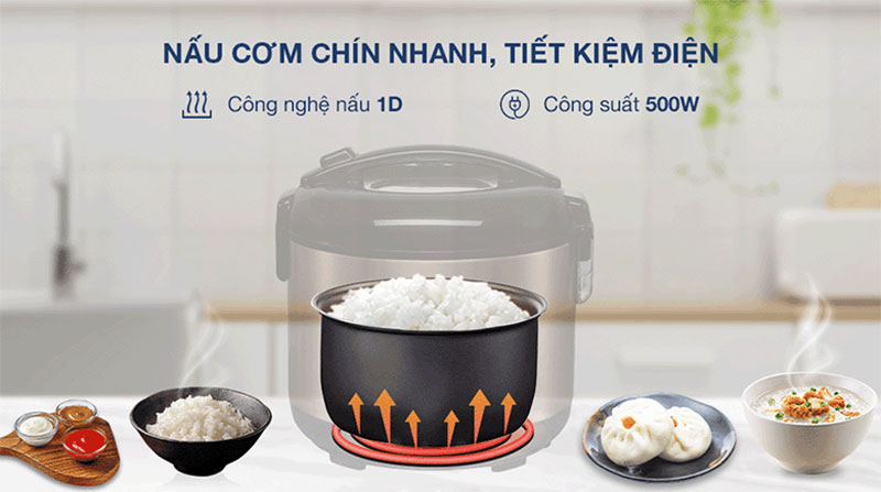 Nấu cơm chín nhanh chóng, tiết kiệm điện với công nghệ nấu 1D và công suất 500W