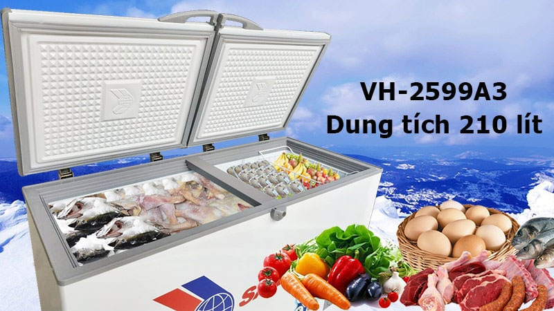 Tủ đông Sanaky VH-2599A3 sở hữu thiết kế nhỏ gọn, hiện đại với màu sắc trang nhã, khung sườn chắc chắn mang đến sự hiện đại không gian nội thất của gia đình bạn. Vỏ ngoài tủ được làm bằng kim loại sơn tĩnh điện cao cấp chống gỉ sét, rò rỉ điện an toàn cho người sử dụng. Hai cánh tủ đóng mở riêng biệt cùng tay nắm ấn tượng giúp việc đóng mở tủ trở nên nhẹ nhàng hơn.
