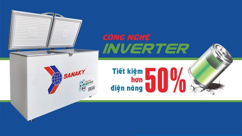 Ngoài ra, tủ đông còn được trang bị công nghệ hoàn toàn mới với máy nén Inverter tiết kiệm đến 50% điện năng tiêu thụ so với các dòng tủ thông thường. Máy nén biến tần Inverter còn giúp máy vận hành êm ái, không gây ồn ào ảnh hưởng đến người dùng.