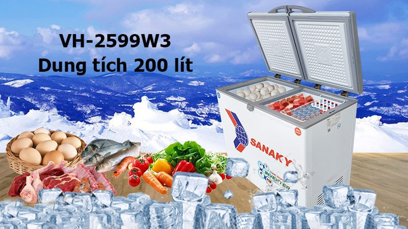 Tủ đông Inverter Sanaky VH-2299W3 có dung tích 200 lít, với kích thước chiều dài: 1.08m, chiều rộng: 0.62m, chiều cao: 0.845m phù hợp sử dụng cho gia đình, bách hóa, nhà hàng, căng tin, có nhu cầu bảo quản đa dạng các loại hàng hóa, thực phẩm.